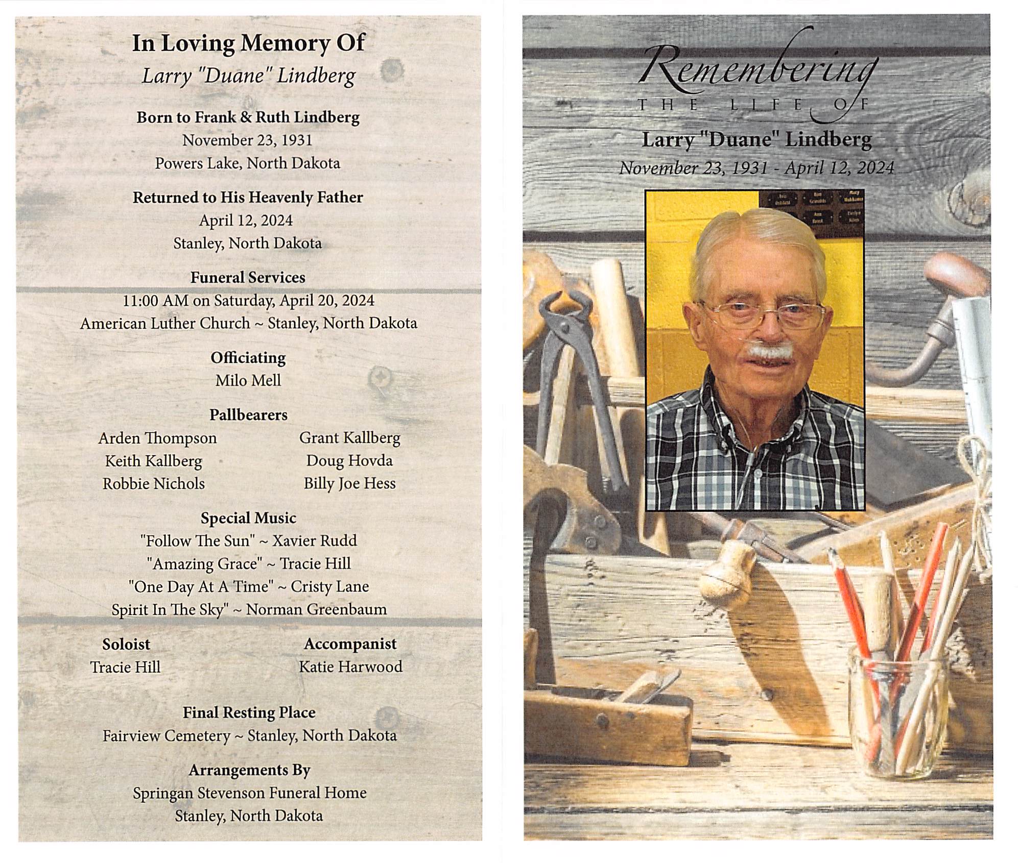 Larry “Duane” Lindberg, 92, of Stanley, ND, passed away on Friday, April 12, 2024, at the Mountrail Bethel Home in Stanley, ND.