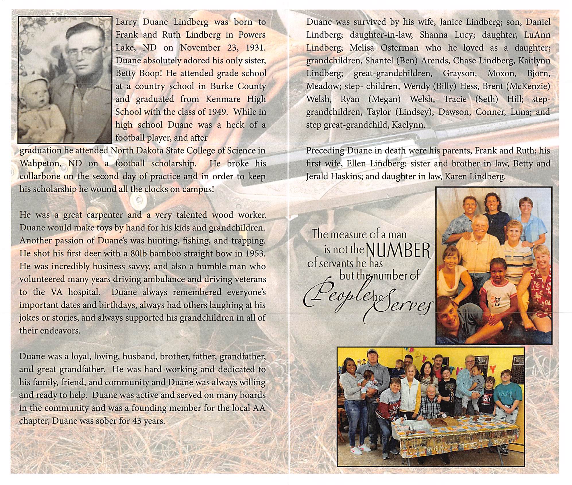 Larry Duane Lindberg was born to Frank and Ruth Lindberg in Powers Lake, ND on November 23, 1931. Duane absolutely adored his only sister, Betty Boop! He attended grade school at a country school in Burke County and graduated from Kenmare High School with the class of 1949. While in high school Duane was a heck of a football player, and after graduation he attended North Dakota State College of Science in Wahpeton, ND on a football scholarship. He broke his collarbone on the second day of practice and in order to keep his scholarship he wound all the clocks on campus!