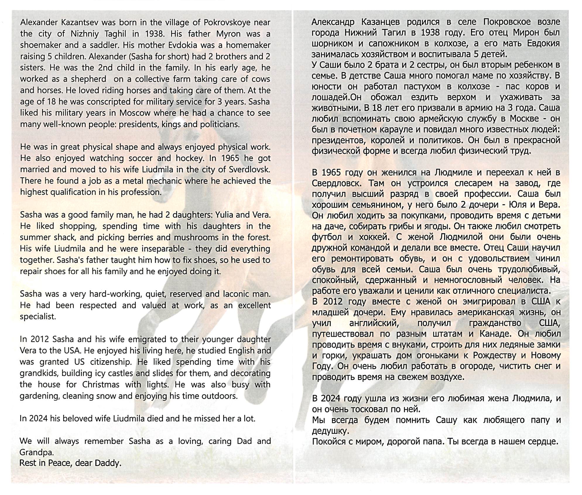 Sasha was a good family man, he had 2 daughters: Yulia and Vera. He liked shopping, spending time with his daughters in the summer shack, and picking berries and mushrooms in the forest. His wife Liudmila and he were inseparable - they did everything together. Sasha's father taught how to fix shoes, so he used to repair shoes for all his family and he enjoyed doing it.
