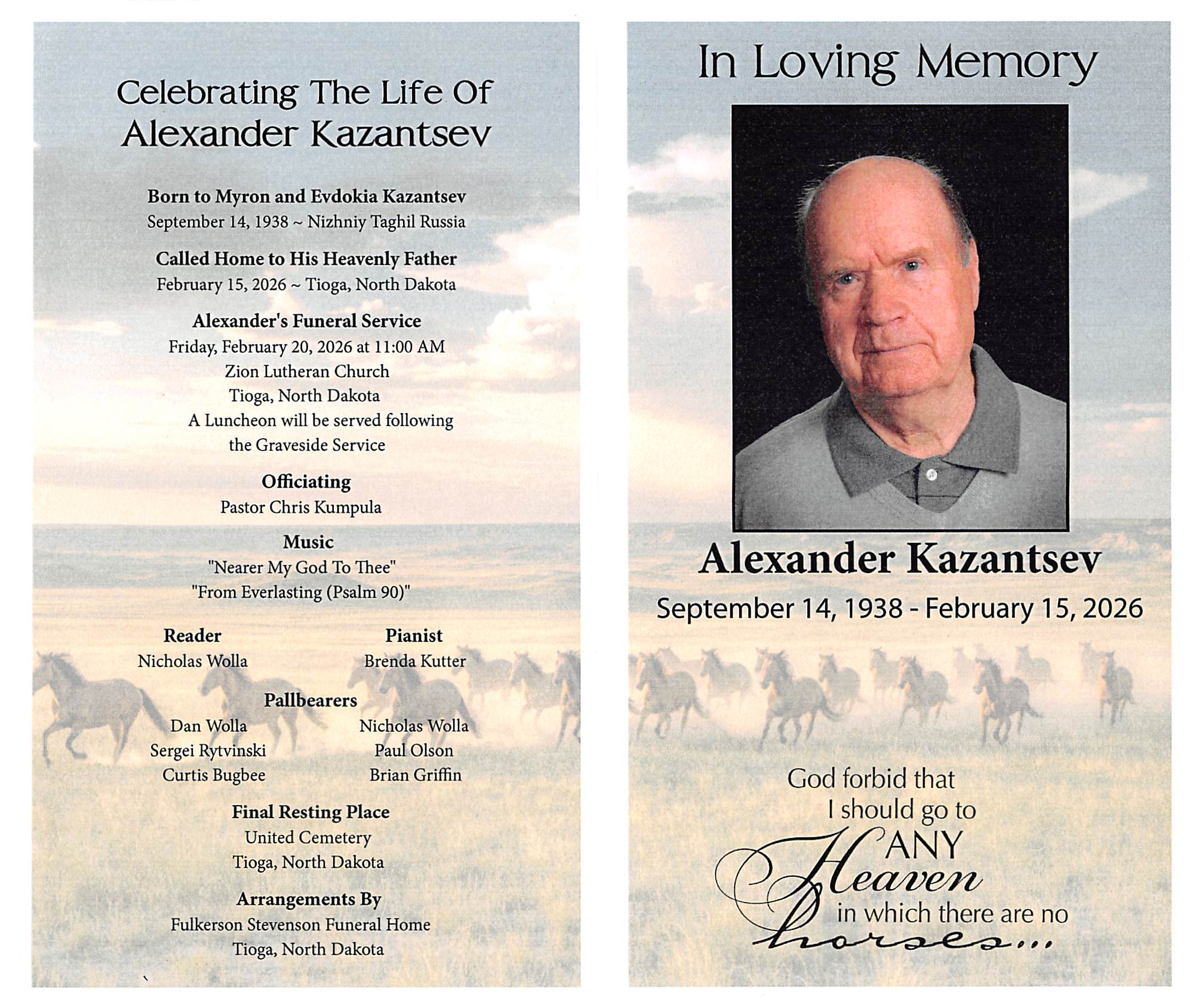 Alexander Kazantsev, 87, of Tioga, ND, passed away on Sunday, February 15, 2026 at the Tioga Long Term Care in Tioga, ND.